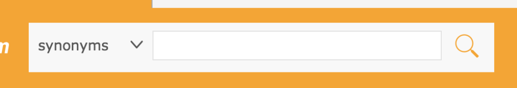 一番上の検索バーの横に【synonyms】(類語)の表示があるのを確認してから、単語をタイプして検索します。(”definition” モードにも切り替え可能。そちらは普通の辞書)