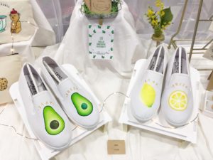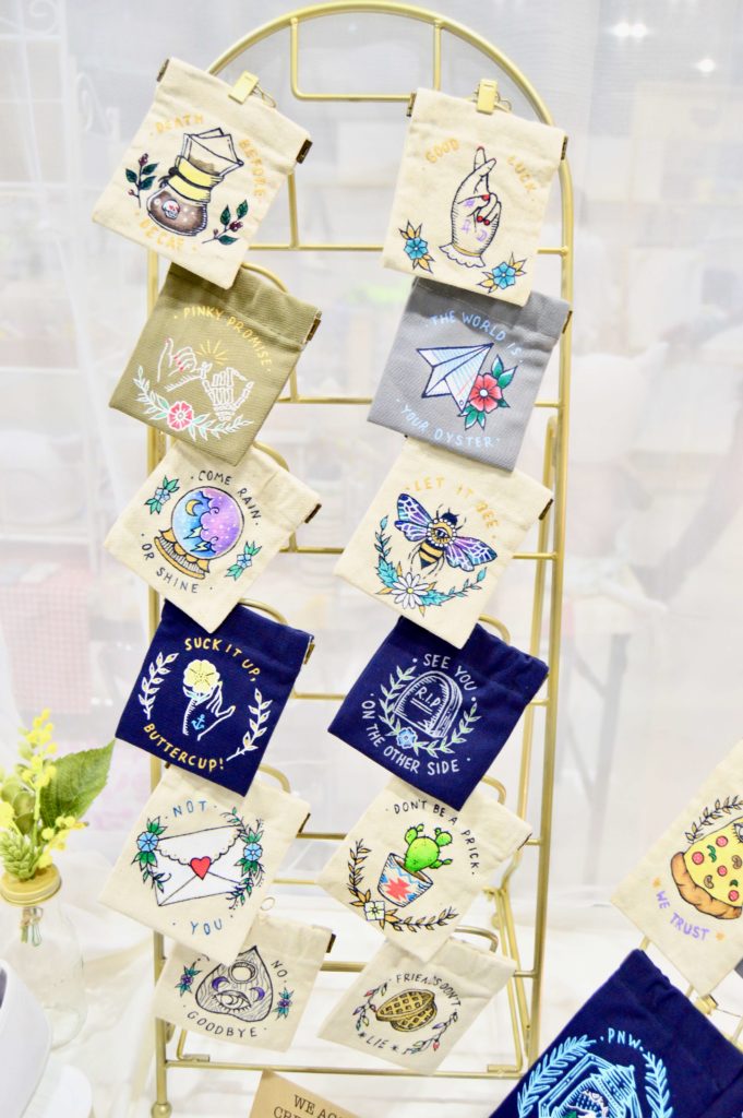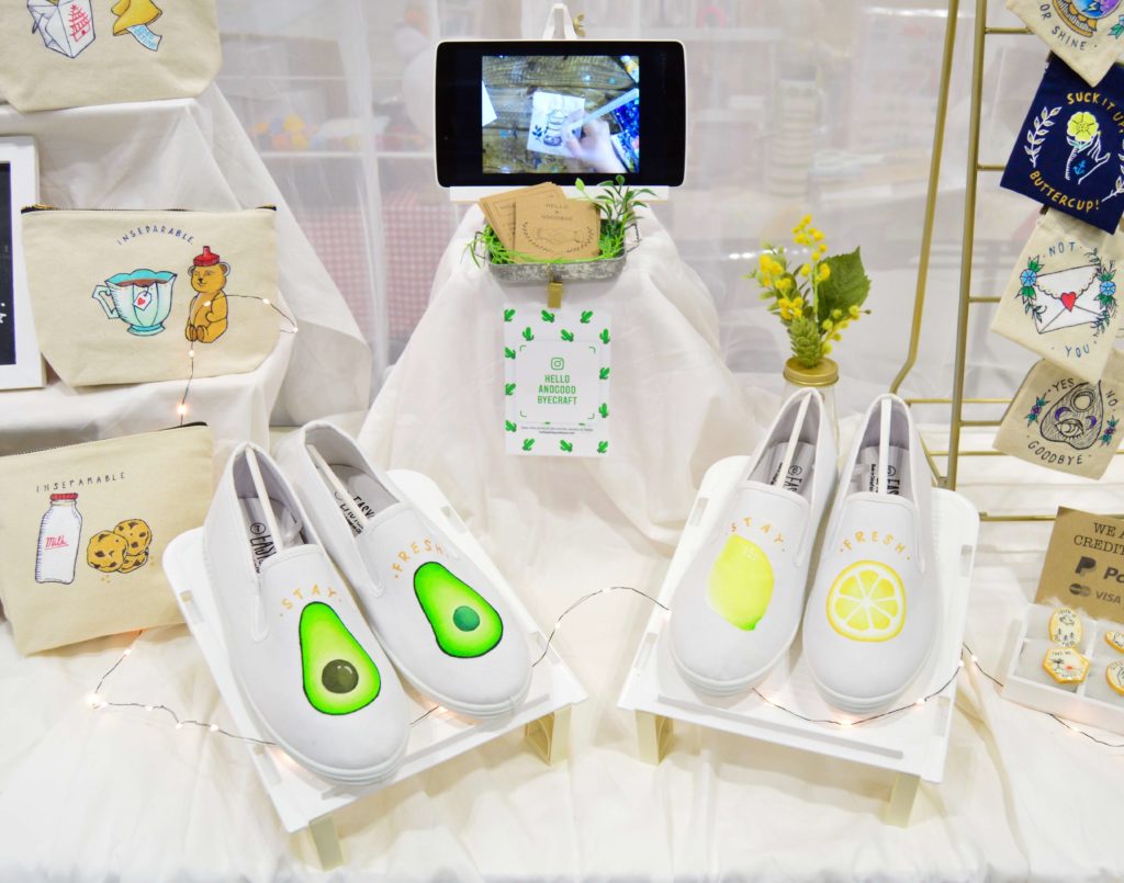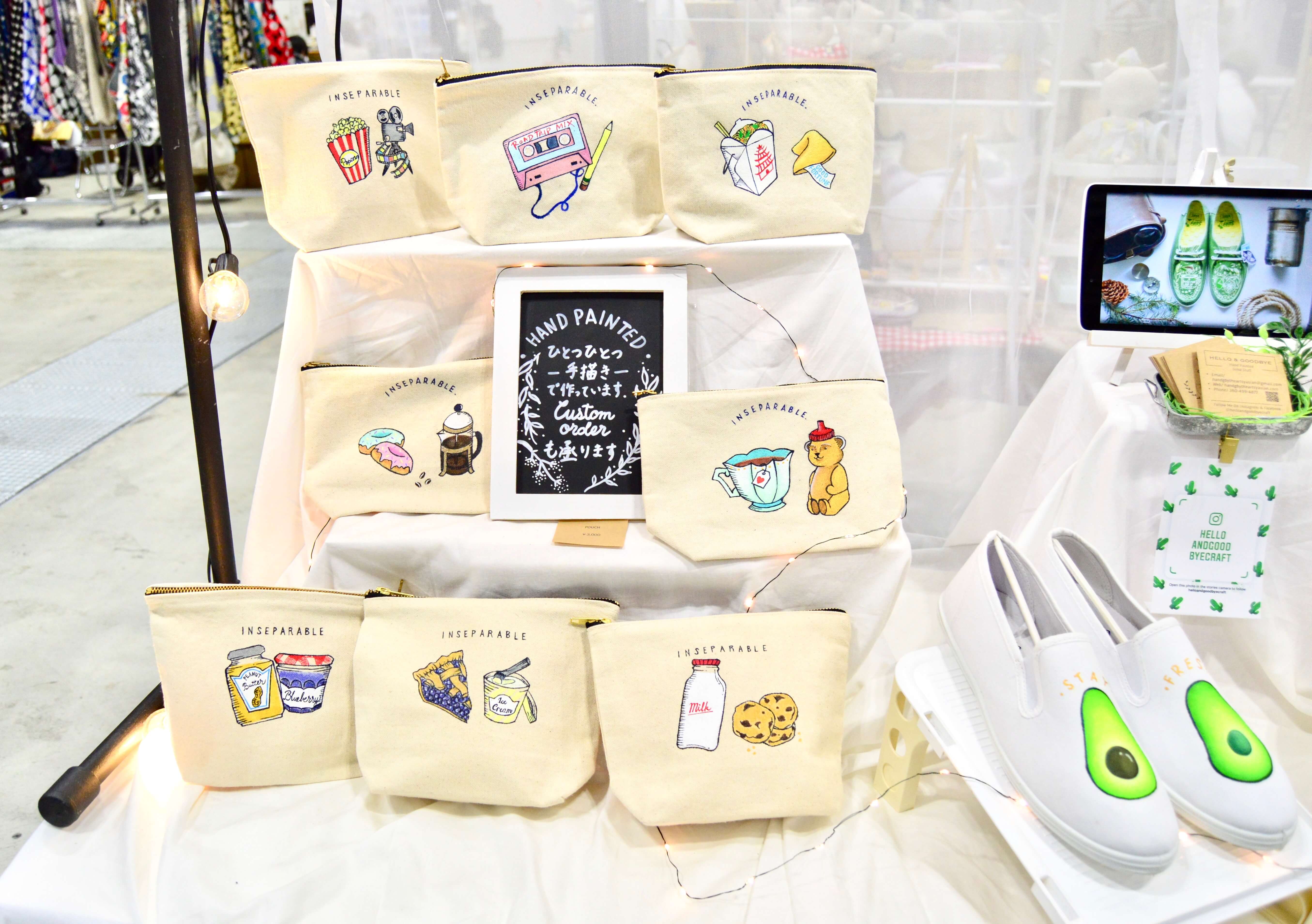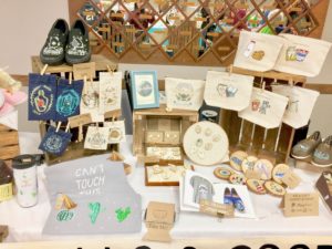 日本と言うかminneのカラーだと思いますが、うさぎ、クマ、りす等の愛くるしい動物モチーフ、お花のアクセサリー、キャンディーやお寿司柄の食べ物をあしらった小物…など、可愛いらしい物を売っているブースが多い印象でした!