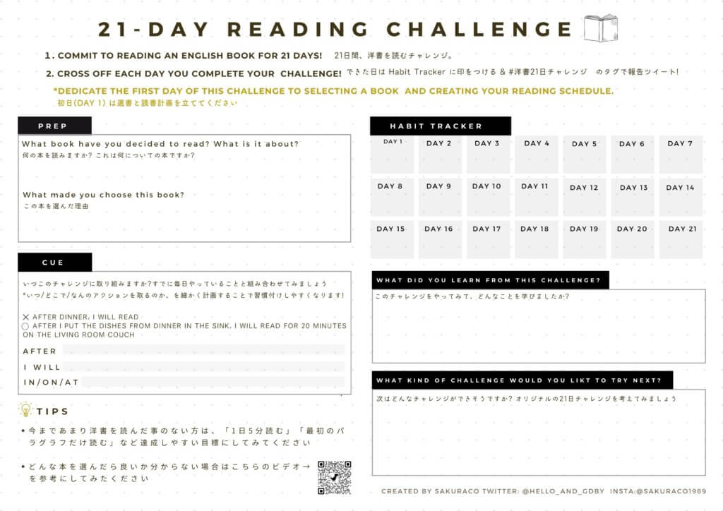 読書に限らずですが「WHY」つまり動機がしっかりしてない目標や計画って挫折しがちですよね。なのでぜひ「なんで洋書の読書習慣を身につけたいんだっけ?」と自分に聞いてあげるのもオススメです◎
