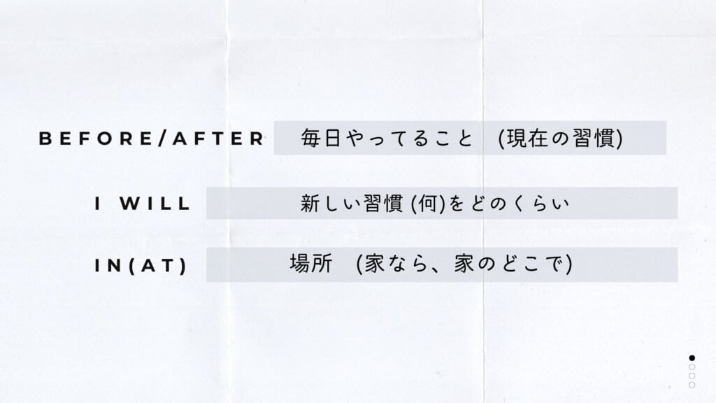 [現在の習慣]をやったあと[どこ]で[何をどのくらい]やる。