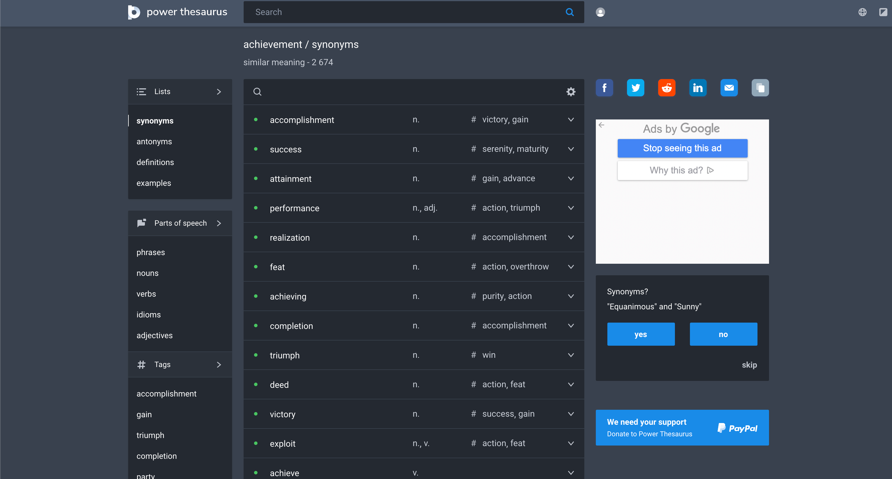 こんな良い事ずくめの類語辞典、大手のサービスを使っても良いのですが、私のダントツのお気に入りはPower Thesaurus!