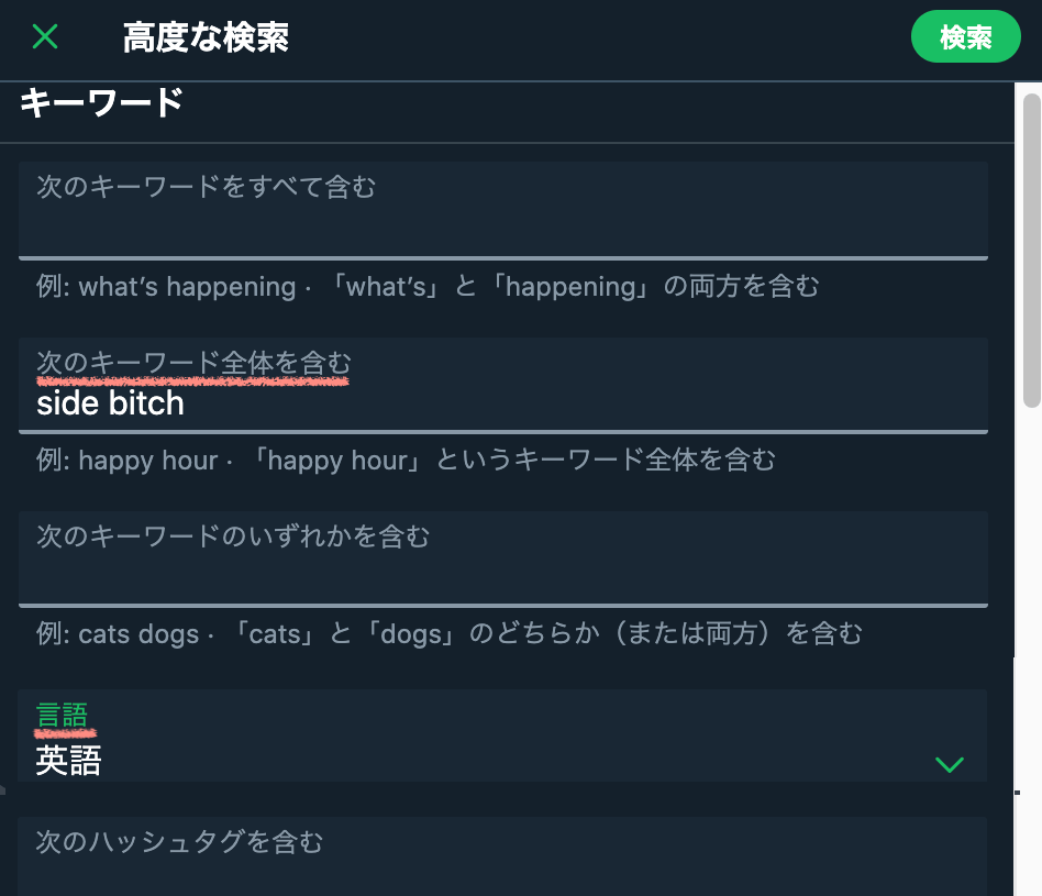 例)「side bitch」の用法を調べたい場合→ ”side bitch” lang:en