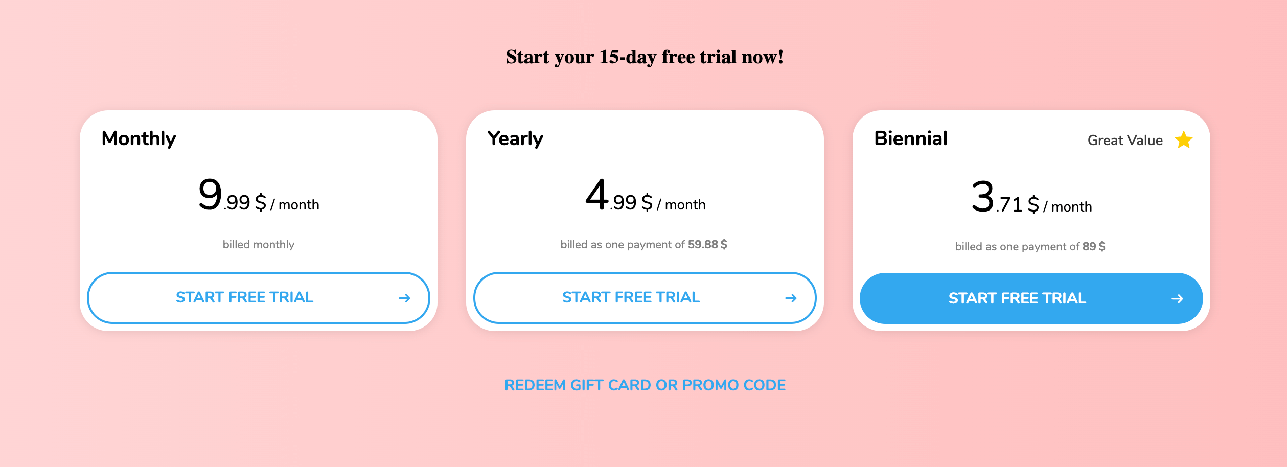利用料金は月々更新の場合$9.99。1年プランに申し込めば$59.88($4.99/月)2年プランの場合は$89(月々$3.71/月)です。