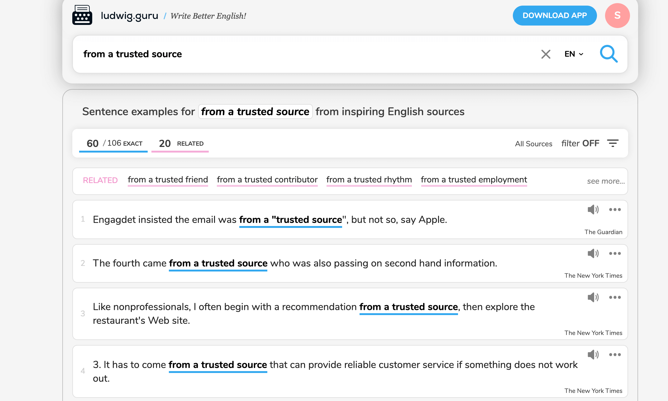 Ludwigでは文や語句を入力すると、信頼出来るソースから例文を引っ張ってきてくれます。