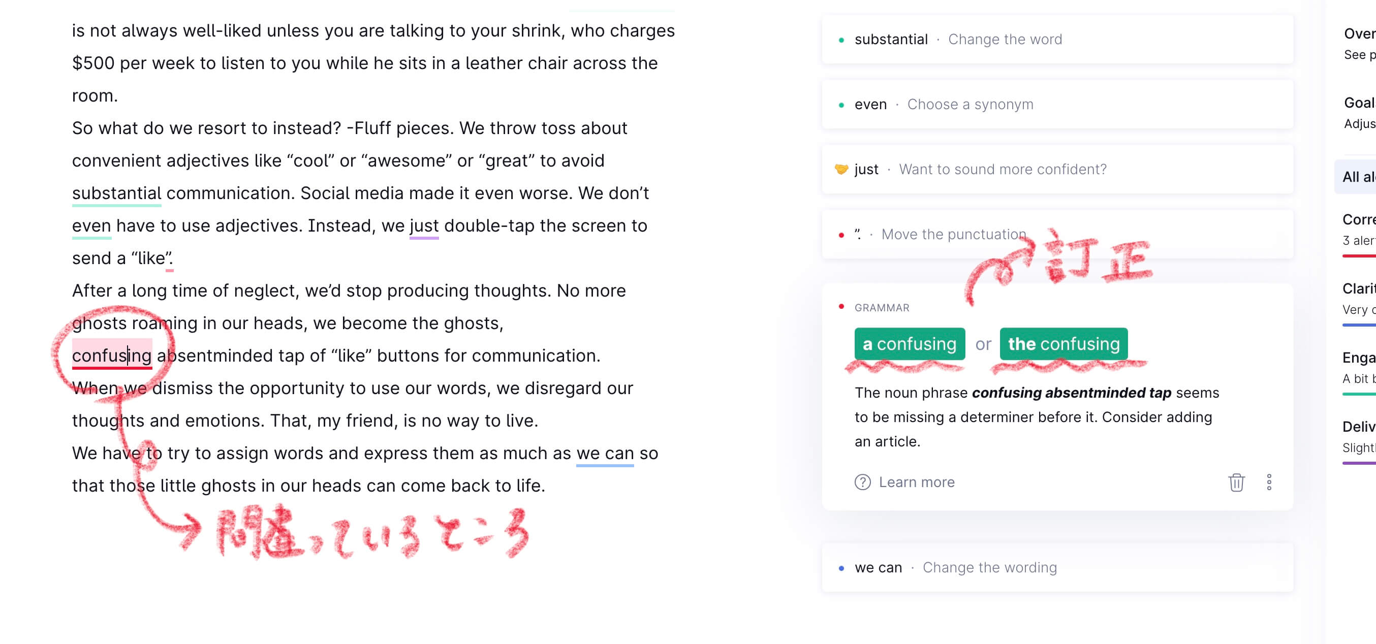 スペルや時制の誤りだけでなく、日本人が間違えやすい冠詞(a や the)の抜けなどもしっかりとカバー。