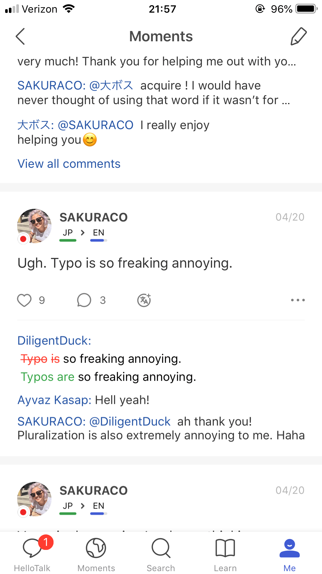 ただしHelloTalkはあくまでも言語学習者が集うアプリなので、添削がつかない事もあります。